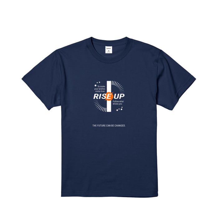 半袖の深いボディ色のフロントに「RISE UP」を配したタイポグラフィデザイン。