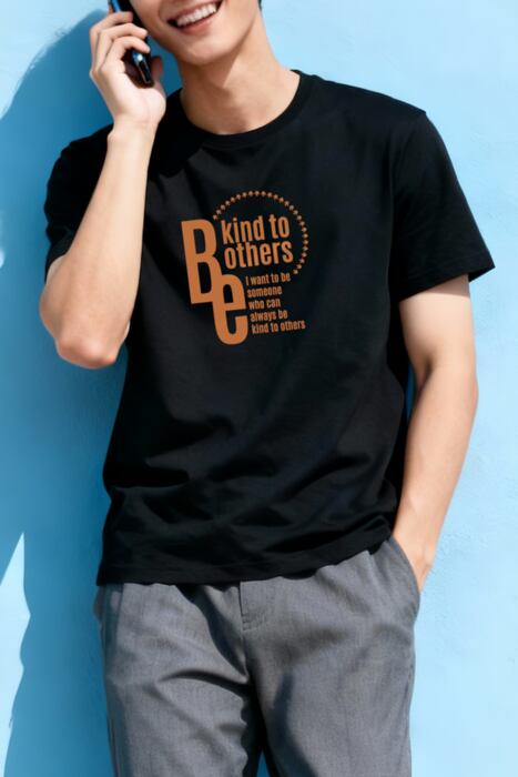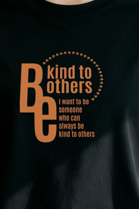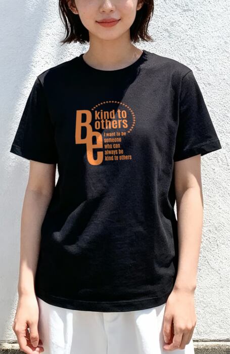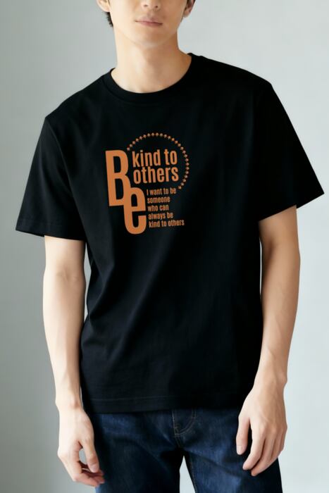 半袖の深いボディ色のフロントに「Be kind to others」を配したタイポグラフィデザイン。
