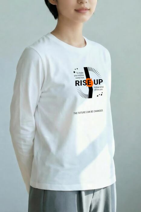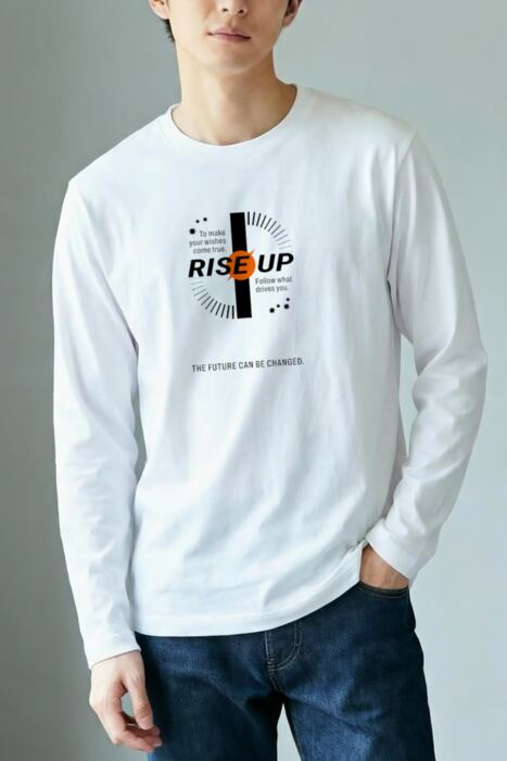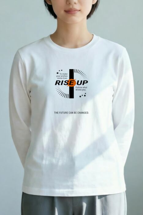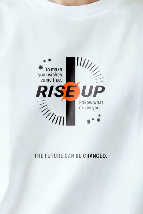 長袖の明るいボディ色のフロントに「RISE UP」を配したタイポグラフィデザイン。