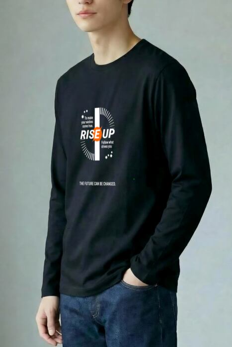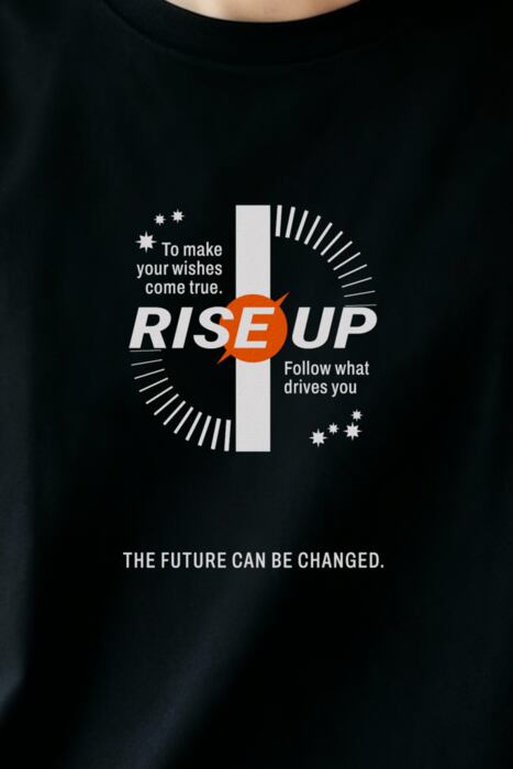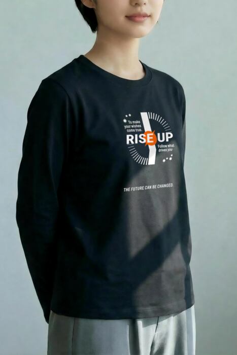 長袖の深いボディ色のフロントに「RISE UP」を配したタイポグラフィデザイン。