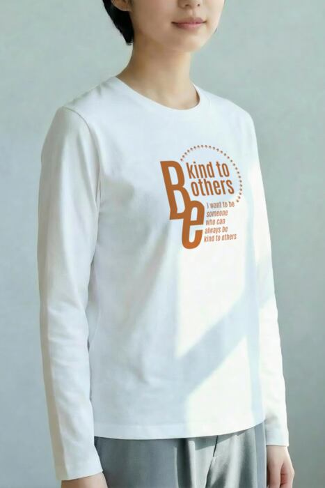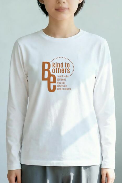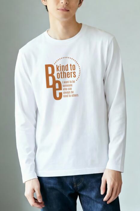 長袖の明るいボディ色のフロントに「Be kind to others」を配したタイポグラフィデザイン。