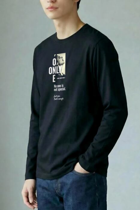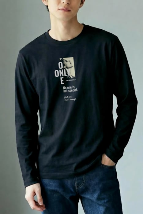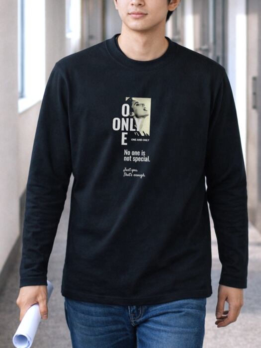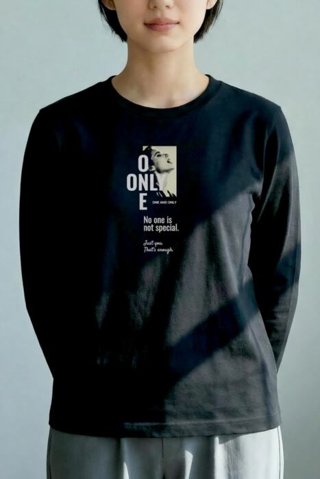 長袖の深いボディ色のフロントに「ONE」「ONLY]が十字に交差するタイポグラフィデザイン。自分らしくいる。ただそれだけでいい。
