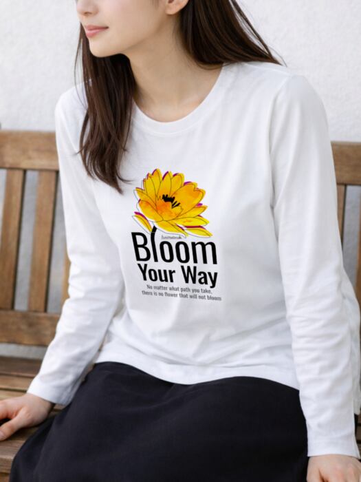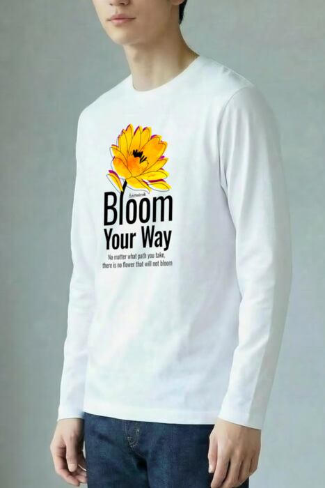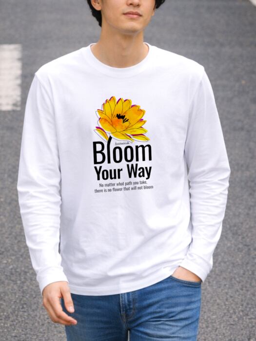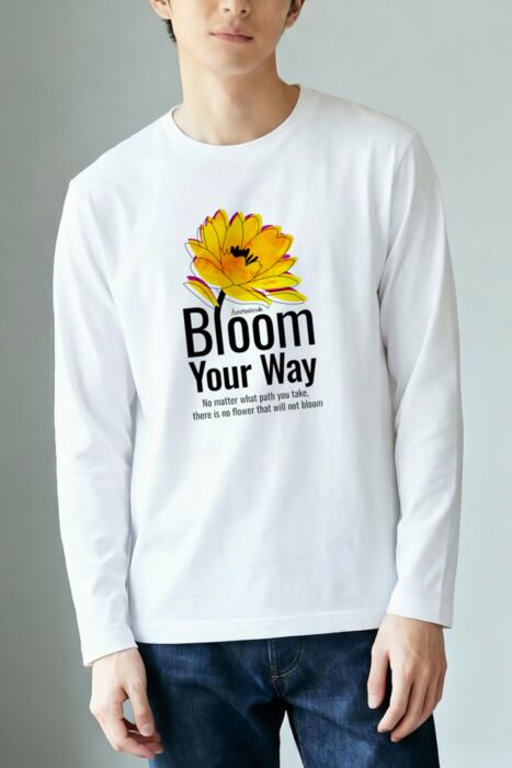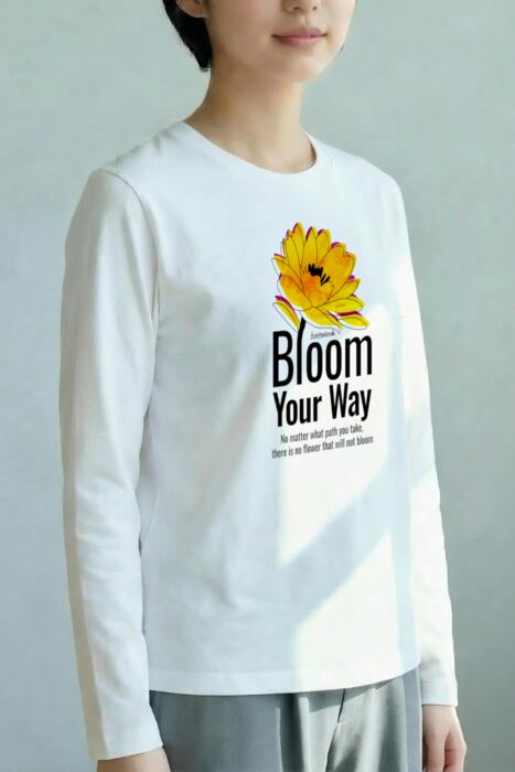 長袖の明るいボディ色のフロントに大きく咲いた花を配したタイポグラフィデザイン。